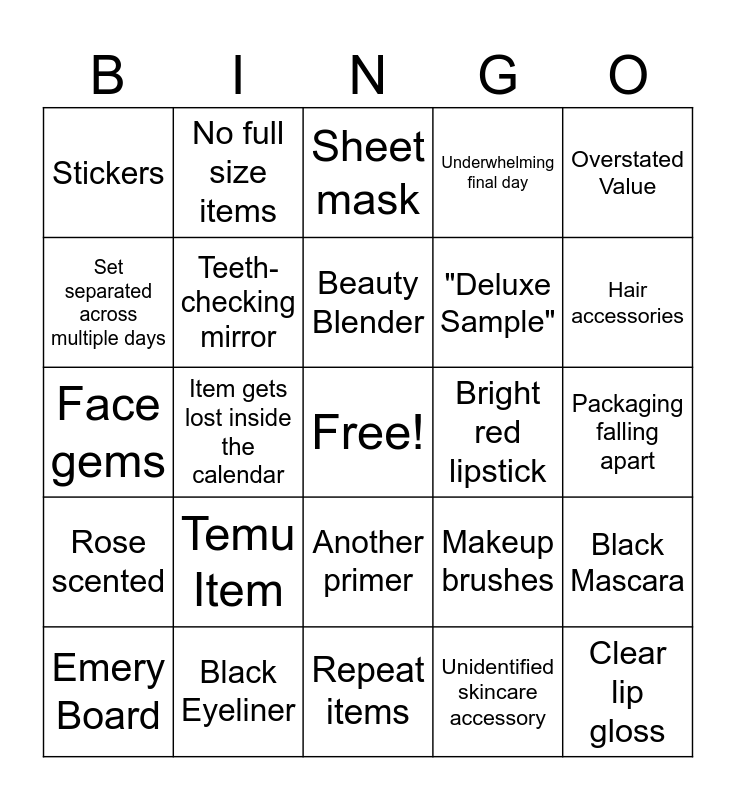 This bingo card has a free space and 24 words: Temu Item, Black Eyeliner, Beauty Blender, Emery Board, Overstated Value, Stickers, Set separated across multiple days, No full size items, Bright red lipstick, Another primer, "Deluxe Sample", Face gems, Makeup brushes, Black Mascara, Teeth-checking mirror, Unidentified skincare accessory, Packaging falling apart, Sheet mask, Hair accessories, Item gets lost inside the calendar, Clear lip gloss, Rose scented, Underwhelming final day and Repeat items.