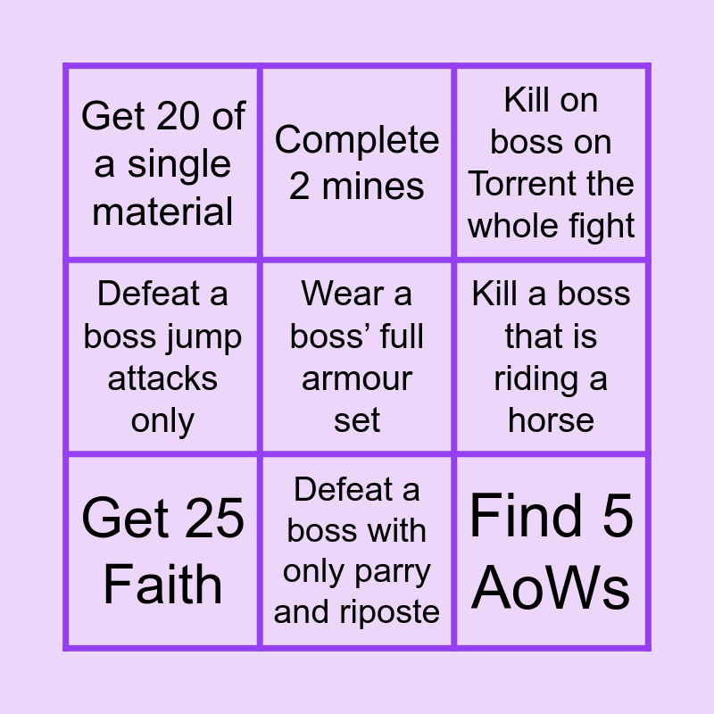 This bingo card has a free space and 8 words: Kill a boss that is riding a horse, Kill on boss on Torrent the whole fight, Complete 2 mines, Get 25 Faith, Get 20 of a single material, Find 5 AoWs, Defeat a boss jump attacks only and Defeat a boss with only parry and riposte.