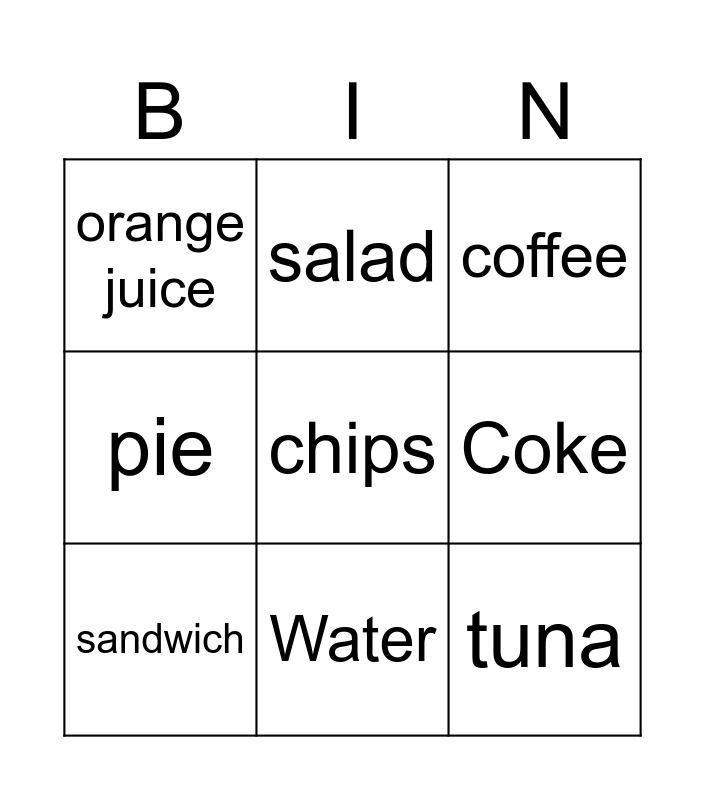 This bingo card has 13 words: Food, Burger, sandwich, salad, pie, chips, tuna, chicken, Water, orange juice, Coke, coffee and tea.