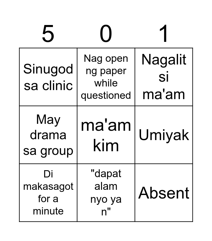 This bingo card has a free space and 8 words: Umiyak, Nagalit si ma'am, Nag open ng paper while questioned, Di makasagot for a minute, Sinugod sa clinic, Absent, May drama sa group and "dapat alam nyo yan".