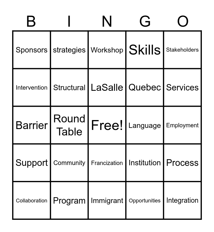 This bingo card has a free space and 25 words: Community, Immigrant, LaSalle, Collaboration, Stakeholders, Sponsors, Intervention, strategies, Language, Francization, Quebec, Barrier, Institution, Process, Structural, Marginalization, Employment, Workshop, Services, Round Table, Integration, Program, Support, Skills and Opportunities.