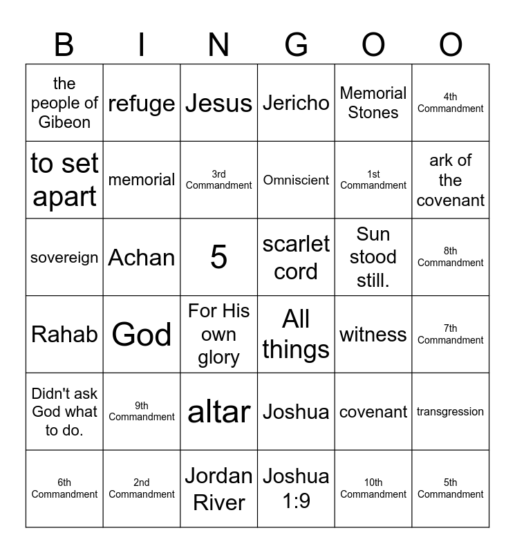 This bingo card has 36 words: Joshua, altar, Joshua 1:9, to set apart, Rahab, scarlet cord, memorial, Jordan River, Memorial Stones, covenant, ark of the covenant, Jericho, transgression, Achan, Omniscient, the people of Gibeon, Didn't ask God what to do., Sun stood still., sovereign, Jesus, 5, God, All things, For His own glory, witness, refuge, 1st Commandment, 2nd Commandment, 3rd Commandment, 4th Commandment, 5th Commandment, 6th Commandment, 7th Commandment, 8th Commandment, 9th Commandment and 10th Commandment.