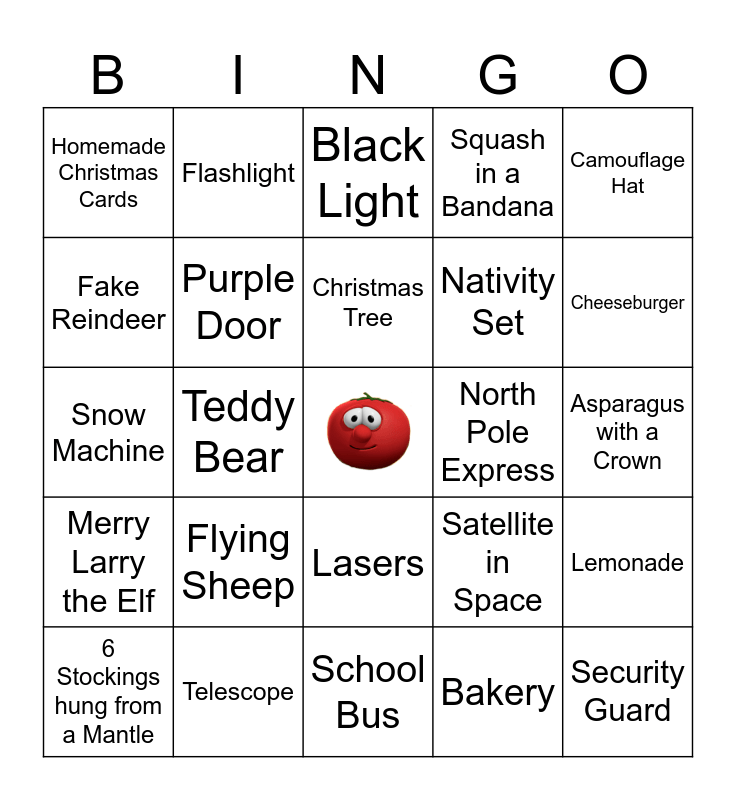 This bingo card has a free space and 38 words: Singing Squashes, Madame Blueberry, Larry Boy, Purple Door, Lemonade, Flying Sheep, Christmas Tree, Reindeer Sweater, Camouflage Hat, Nativity Set, Teddy Bear, Squash in a Bandana, Security Guard, Asparagus with a Crown, Fake Reindeer, Merry Larry the Elf, Sonic Labradoodle, Black Light, Purple Beanie, North Pole Express, Homemade Christmas Cards, Telescope, Cheeseburger, 6 Stockings hung from a Mantle, Gift Wrapped Cucumber, School Bus, Magnifying Glass, Chocolate Frozen Yogurt, Flying Angels, Dancing Bears, Plunger, Lasers, Bakery, Flashlight, News Helicopter, Satellite in Space, Snow Machine and Candlelight Carolers.