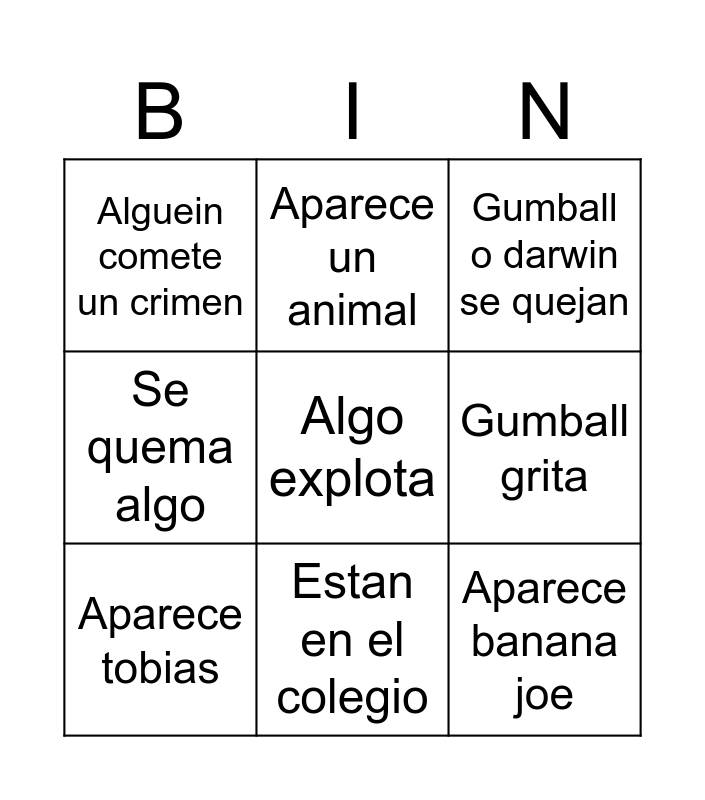 This bingo card has a free space and 8 words: Gumball grita, Gumball o darwin se quejan, Aparece un animal, Aparece tobias, Alguein comete un crimen, Aparece banana joe, Se quema algo and Estan en el colegio.