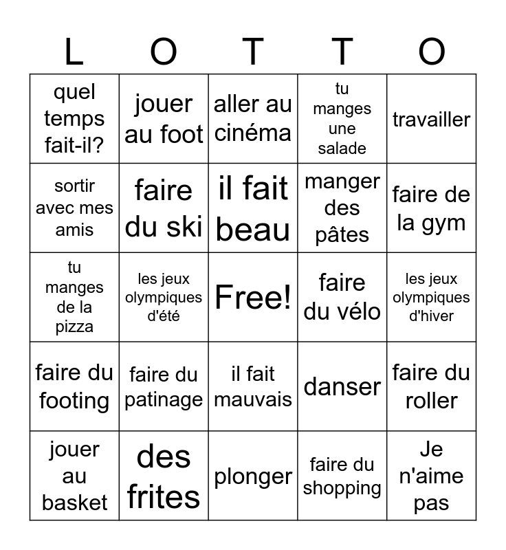 This bingo card has a free space and 28 words: faire du roller, nager, manger des pâtes, faire du shopping, sortir avec mes amis, aller au cinéma, jouer au foot, faire du footing, faire du vélo, jouer au basket, tu manges de la pizza, tu manges une salade, des frites, plonger, faire de la gym, jouer au hockey sur glace, faire du patinage, faire du ski, il fait beau, il fait mauvais, quel temps fait-il?, J'aime, Je n'aime pas, les jeux olympiques d'été, les jeux olympiques d'hiver, danser, travailler and qu'est-ce que tu aimes faire?.