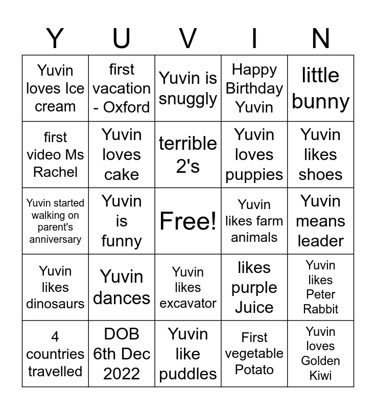This bingo card has a free space and 41 words: Yuvin likes cats, Yuvin started walking on parent's anniversary, Cheeky little boy, Yuvin loves cake, DOB 6th Dec 2022, Yuvin likes excavator, terrible 2's, hopping, little bunny, Yuvin likes dinosaurs, Yuvin is funny, Happy Birthday Yuvin, Yuvin loves Golden Kiwi, Yuvin means leader, Yuvin likes farm animals, Yuvin dances, Yuvin likes chips, Yuvin loves Ice cream, Yuvin eats Blueberries, Yuvin is snuggly, Yuvin likes Peter Rabbit, Yuvin likes Rhymes, Yuvin like puddles, Yuvin loves puppies, first word papa, first dish - Sweet Kheer, First vegetable Potato, Likes Fire Engine, Yuvin likes shoes, Friendly, first day in nursery- 15 Feb 2024, first vacation - Oxford, 4 countries travelled, picky eater, likes purple Juice, first video Ms Rachel, Peter Rabbit Theme party, first haircut in 11th Month, hates diaper change time, Yuvin likes bedtime stories and started crawling in 8 months.