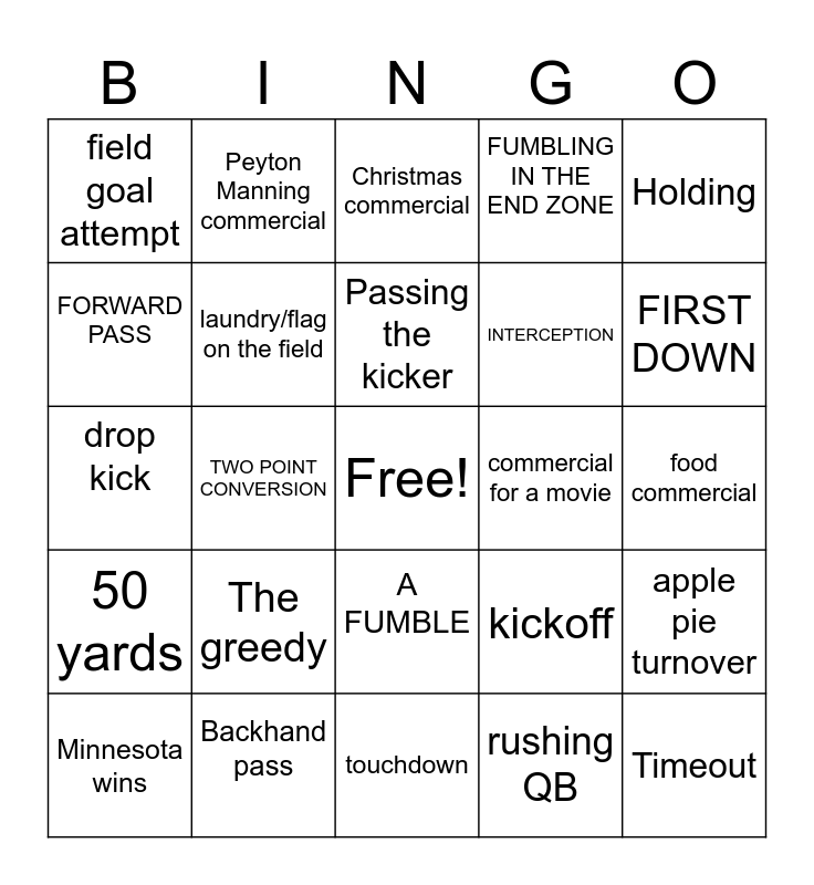 This bingo card has a free space and 24 words: Minnesota wins, The greedy, Passing the kicker, rushing QB, Holding, field goal attempt, Peyton Manning commercial, Christmas commercial, commercial for a movie, food commercial, drop kick, laundry/flag on the field, kickoff, apple pie turnover, FORWARD PASS, Backhand pass, touchdown, FUMBLING IN THE END ZONE, FIRST DOWN, 50 yards, TWO POINT CONVERSION, A FUMBLE, INTERCEPTION and Timeout.