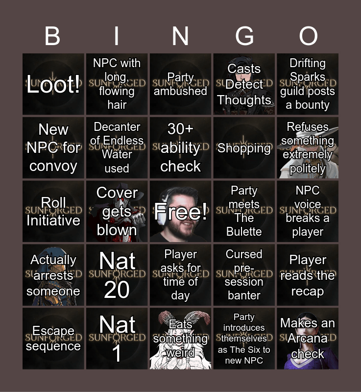 This bingo card has 24 images, a free space and 24 words: Nat 20, Nat 1, 30+ ability check, Escape sequence, Drifting Sparks guild posts a bounty, Loot!, New NPC for convoy, NPC with long, flowing hair, Party meets The Bulette, Player asks for time of day, Shopping, Roll Initiative, Cursed pre-session banter, Player reads the recap, Decanter of Endless Water used, Party introduces themselves as The Six to new NPC, NPC voice breaks a player, Party ambushed, Refuses something extremely politely, Cover gets blown, Makes an Arcana check, Actually arrests someone, Casts Detect Thoughts and Eats something weird.