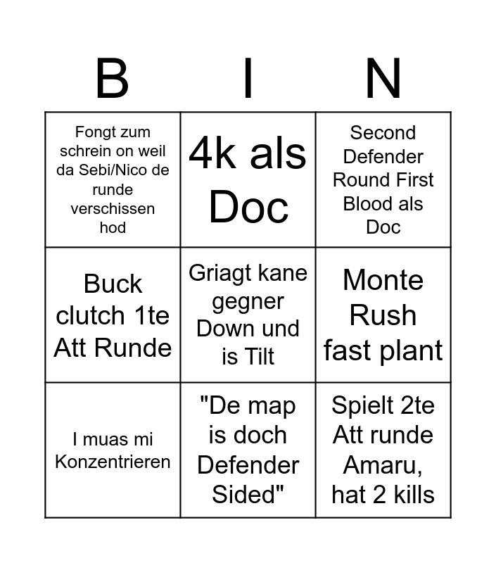 This bingo card has 9 words: I muas mi Konzentrieren, Second Defender Round First Blood als Doc, 4k als Doc, Buck clutch 1te Att Runde, Fongt zum schrein on weil da Sebi/Nico de runde verschissen hod, Monte Rush fast plant, Griagt kane gegner Down und is Tilt, Spielt 2te Att runde Amaru, hat 2 kills and "De map is doch Defender Sided".