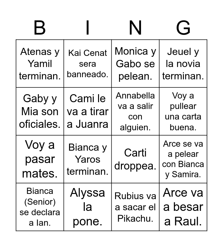 This bingo card has 16 words: Alyssa la pone., Arce se va a pelear con Bianca y Samira., Monica y Gabo se pelean., Atenas y Yamil terminan., Voy a pasar mates., Kai Cenat sera banneado., Carti droppea., Rubius va a sacar el Pikachu., Gaby y Mia son oficiales., Cami le va a tirar a Juanra, Bianca (Senior) se declara a Ian., Jeuel y la novia terminan., Bianca y Yaros terminan., Voy a pullear una carta buena., Annabella va a salir con alguien. and Arce va a besar a Raul..