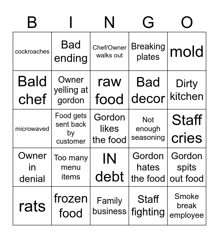 This bingo card has a free space and 24 words: Too many menu items, frozen food, raw food, rats, mold, cockroaches, Bald chef, Bad ending, Not enough seasoning, IN debt, Bad decor, microwaved, Gordon hates the food, Gordon spits out food, Owner yelling at gordon, Staff fighting, Staff cries, Chef/Owner walks out, Dirty kitchen, Food gets sent back by customer, Smoke break employee, Owner in denial, Breaking plates and Family business.
