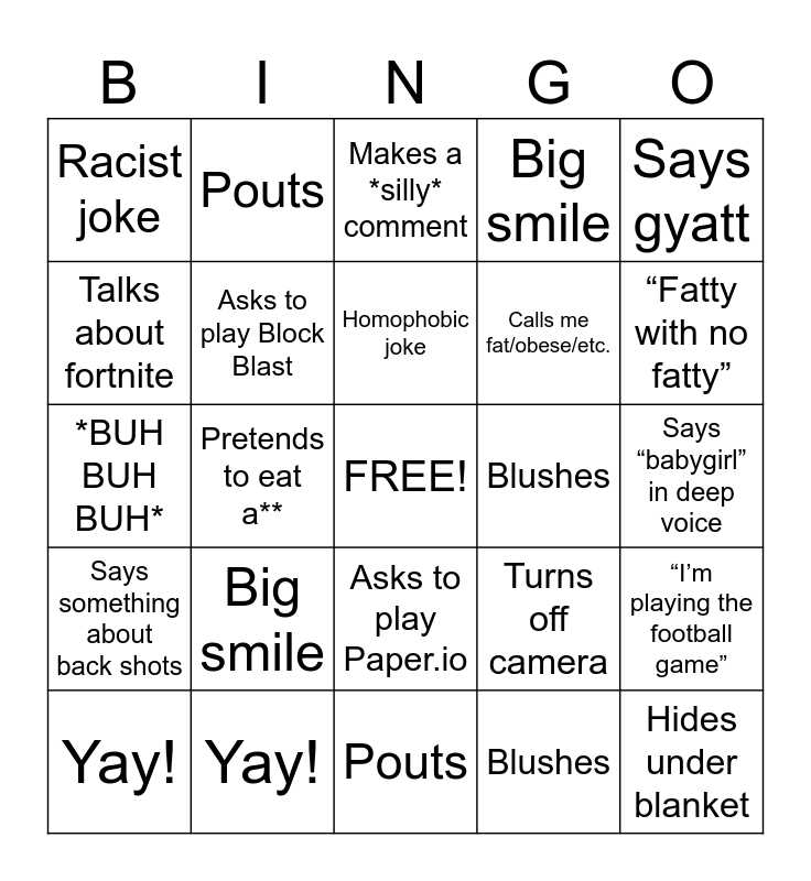 This bingo card has a free space and 24 words: Big smile, Yay!, Homophobic joke, Yay!, Says gyatt, Racist joke, Talks about fortnite, Pouts, Blushes, Asks to play Paper.io, Calls me fat/obese/etc., *BUH BUH BUH*, Turns off camera, “I’m playing the football game”, Asks to play Block Blast, Blushes, Says “babygirl” in deep voice, Makes a *silly* comment, “Fatty with no fatty”, Pretends to eat a**, Hides under blanket, Says something about back shots, Big smile and Pouts.