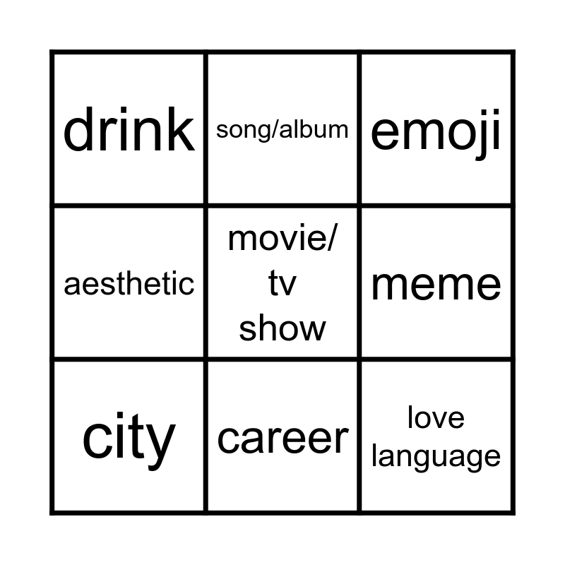 This bingo card has a free space and 8 words: aesthetic, song/album, meme, city, emoji, drink, career and love language.