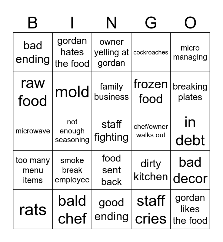 This bingo card has a free space and 24 words: smoke break employee, bald chef, family business, rats, micro managing, bad ending, raw food, gordan hates the food, chef/owner walks out, food sent back, frozen food, microwave, dirty kitchen, bad decor, mold, staff cries, in debt, owner yelling at gordan, breaking plates, not enough seasoning, gordan likes the food, too many menu items, cockroaches and good ending.