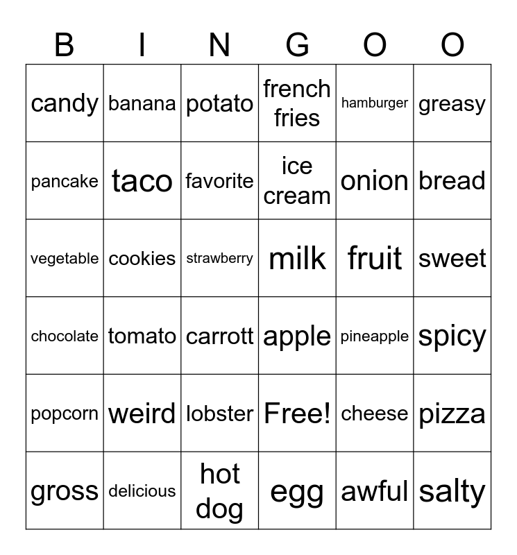 This bingo card has 36 words: Free!, lobster, egg, pancake, chocolate, milk, taco, hot dog, hamburger, cheese, bread, french fries, pizza, cookies, ice cream, candy, popcorn, fruit, vegetable, potato, strawberry, tomato, apple, carrott, pineapple, banana, onion, delicious, favorite, greasy, salty, gross, spicy, sweet, weird and awful.