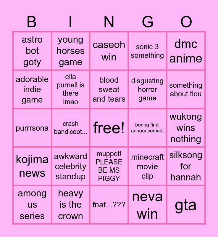 This bingo card has a free space and 24 words: among us series, awkward celebrity standup, blood sweat and tears, neva win, dmc anime, astro bot goty, young horses game, caseoh win, boring final announcement, wukong wins nothing, purrrsona, ella purnell is there lmao, minecraft movie clip, silksong for hannah, adorable indie game, heavy is the crown, fnaf...???, sonic 3 something, something about tlou, kojima news, crash bandicoot..., muppet! PLEASE BE MS PIGGY, disgusting horror game and gta.