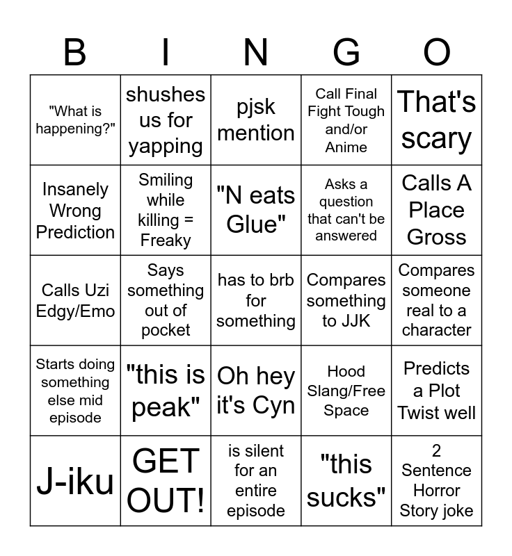 This bingo card has 25 words: "this is peak", is silent for an entire episode, "N eats Glue", J-iku, That's scary, "What is happening?", Insanely Wrong Prediction, shushes us for yapping, Compares something to JJK, Oh hey it's Cyn, Asks a question that can't be answered, Calls Uzi Edgy/Emo, Hood Slang/Free Space, Predicts a Plot Twist well, Smiling while killing = Freaky, 2 Sentence Horror Story joke, Compares someone real to a character, pjsk mention, Calls A Place Gross, Says something out of pocket, has to brb for something, GET OUT!, Starts doing something else mid episode, Call Final Fight Tough and/or Anime and "this sucks".