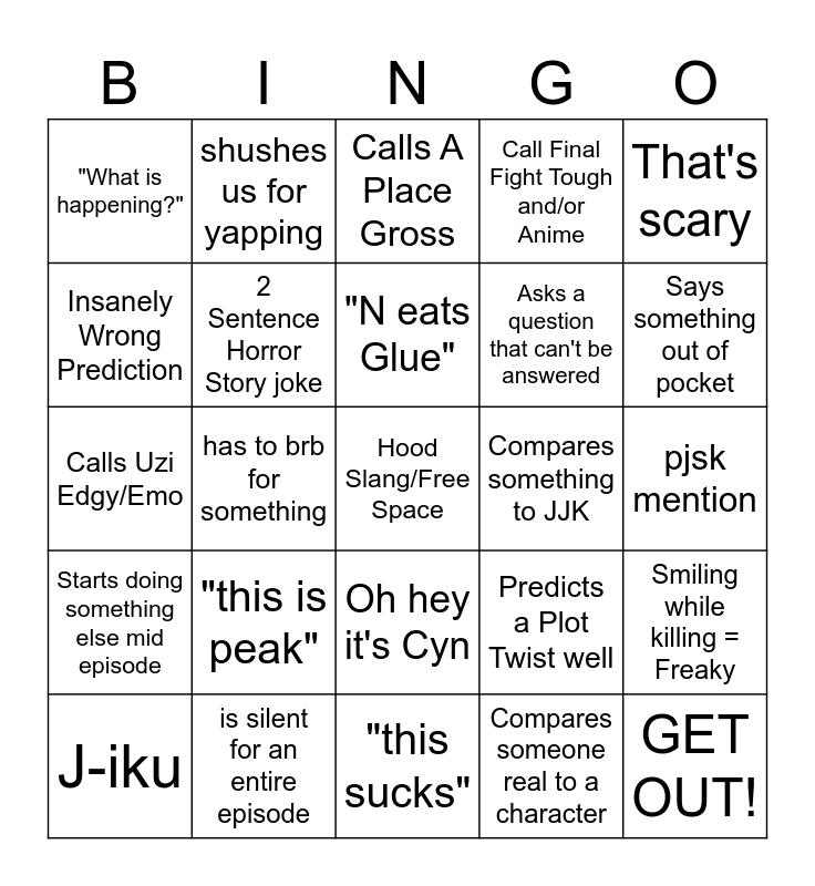 This bingo card has a free space and 24 words: "this is peak", is silent for an entire episode, "N eats Glue", J-iku, That's scary, "What is happening?", Insanely Wrong Prediction, shushes us for yapping, Compares something to JJK, Oh hey it's Cyn, Asks a question that can't be answered, Calls Uzi Edgy/Emo, Predicts a Plot Twist well, Smiling while killing = Freaky, 2 Sentence Horror Story joke, Compares someone real to a character, pjsk mention, Calls A Place Gross, Says something out of pocket, has to brb for something, GET OUT!, Starts doing something else mid episode, Call Final Fight Tough and/or Anime and "this sucks".