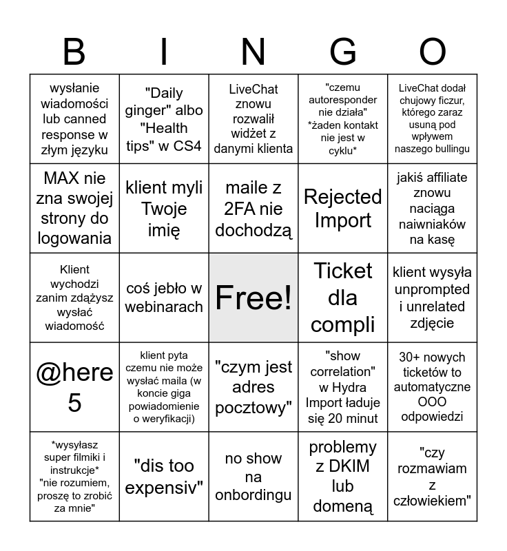 This bingo card has a free space and 38 words: "dzi臋kuj臋 za pomoc 馃槉" *Bad rate*, Maddie nie rozumie automation, "hi, i have this automation and...", klient myli Twoje imi臋, 30+ nowych ticket贸w to automatyczne OOO odpowiedzi, klient pyta czemu nie mo偶e wys艂a膰 maila (w koncie giga powiadomienie o weryfikacji), maile z 2FA nie dochodz膮, IT zamyka taska bez rozwi膮zania "won't do", LiveChat doda艂 chujowy ficzur, kt贸rego zaraz usun膮 pod wp艂ywem naszego bullingu, Rejected Import, co艣 jeb艂o w webinarach, "czemu autoresponder nie dzia艂a" *偶aden kontakt nie jest w cyklu*, "czy rozmawiam z cz艂owiekiem", klient wysy艂a unprompted i unrelated zdj臋cie, MAX nie zna swojej strony do logowania, @here 5, 馃尳boty w cs4, LiveChat znowu rozwali艂 wid偶et z danymi klienta, Ticket dla billingu, Ticket dla compli, wys艂anie wiadomo艣ci lub canned response w z艂ym j臋zyku, "dis too expensiv", jaki艣 affiliate znowu naci膮ga naiwniak贸w na kas臋, *wysy艂asz super filmiki i instrukcje* "nie rozumiem, prosz臋 to zrobi膰 za mnie", Ava: please note the chat is in English only cx: hola hablas espanol?, no show na onbordingu, "chcia艂em doda膰 maila gmail/o2/wp ale wyskakuje b艂膮d", "czemu faktura jest 2x wy偶sza ni偶 miesi膮c temu?" (1000 kontakt贸w poza limit w koncie), Ava wyci膮gn臋艂a jaki艣 bullshit z dupy i teraz trzeba odkr臋ca膰, minimum 3 "gibberish" w cancelach, "your billing/compli/deli is too slow!" (wys艂a艂 4 maile w ci膮gu godziny), "czym jest adres pocztowy", problemy z DKIM lub domen膮, "Daily ginger" albo "Health tips" w CS4, "prosz臋 o kontakt telefoniczny", "show correlation" w Hydra Import 艂aduje si臋 20 minut, Klient wychodzi zanim zd膮偶ysz wys艂a膰 wiadomo艣膰 and Visitor wychodzi w trakcie weryfikacji.