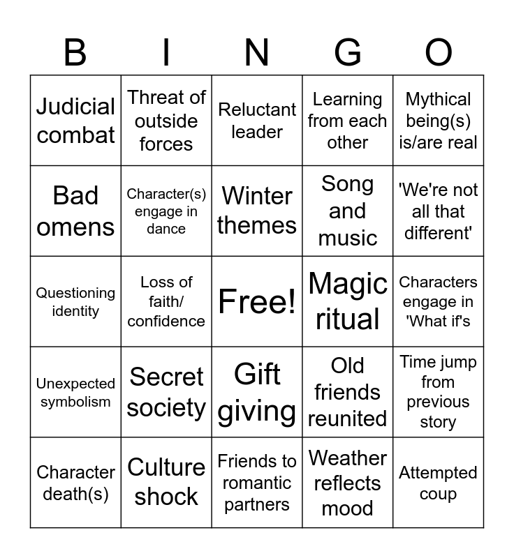 This bingo card has a free space and 24 words: Secret society, Culture shock, Winter themes, Character death(s), Mythical being(s) is/are real, Judicial combat, Bad omens, Threat of outside forces, Magic ritual, Gift giving, Song and music, Questioning identity, Old friends reunited, Time jump from previous story, Character(s) engage in dance, Weather reflects mood, Characters engage in 'What if's, Reluctant leader, 'We're not all that different', Loss of faith/ confidence, Attempted coup, Unexpected symbolism, Learning from each other and Friends to romantic partners.