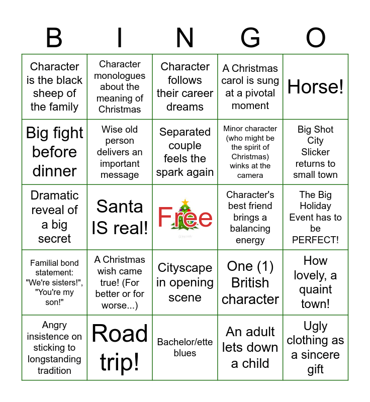 This bingo card has a free space and 60 words: Horrible font in opening credits, Road trip!, Reluctant pair falls in love, Familial bond statement: "We're sisters!", "You're my son!", An adult lets down a child, "But it's Christmas!", Wise old person delivers an important message, Look, mistletoe!, Minor character (who might be the spirit of Christmas) winks at the camera, Type A character learns to loosen up, A Christmas carol is sung at a pivotal moment, Oh no, dinner is ruined!, Big fight before dinner, Weird relative comes to visit, "When I was a little girl...", Character is the black sheep of the family, Ugly clothing as a sincere gift, Horse!, Snowfall on cue, Separated couple feels the spark again, Character's best friend brings a balancing energy, Character follows their career dreams, Angry insistence on sticking to longstanding tradition, How lovely, a quaint town!, We gotta save the business/ town!, Kid plays matchmaker for single parent, Workaholic learns the true meaning of love, I've got an idea, let's switch places!, Big Shot City Slicker returns to small town, "It's our first Christmas without (relative)...", Pretend couple, Christmas flashback, The wedding/ engagement is called off, Clumsy scene, Character monologues about the meaning of Christmas, Playful date montage, Oh no, someone broke the token special decoration!, Santa IS real!, One (1) Jewish character, Dramatic reveal of a big secret, Emotionally distant boyfriend, A Christmas wish came true! (For better or for worse...), The Big Holiday Event has to be PERFECT!, Dancing scene, One (1) British character, Secret royalty, Public kiss followed by applause, Original Christmas song, Corporate suit doesn't care that it's Christmas, Cityscape in opening scene, Bachelor/ette blues, Holiday douchnozzle, Decoration montage, It’s a family/special recipe, “I have to find the perfect gift.”, Someone play a guitar/piano, One year later title card, A new major event/project will make or break a company’s success, Clever holiday pun(s) and FARM!.