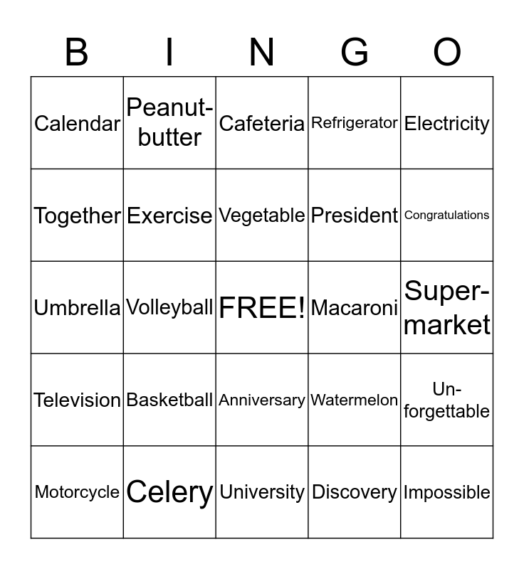 This bingo card has a free space and 24 words: Basketball, Celery, Vegetable, Motorcycle, Electricity, Calendar, Together, Peanut-butter, Macaroni, Anniversary, President, Umbrella, Watermelon, Un-forgettable, Exercise, Discovery, Super- market, Cafeteria, Congratulations, Volleyball, Impossible, Television, Refrigerator and University.