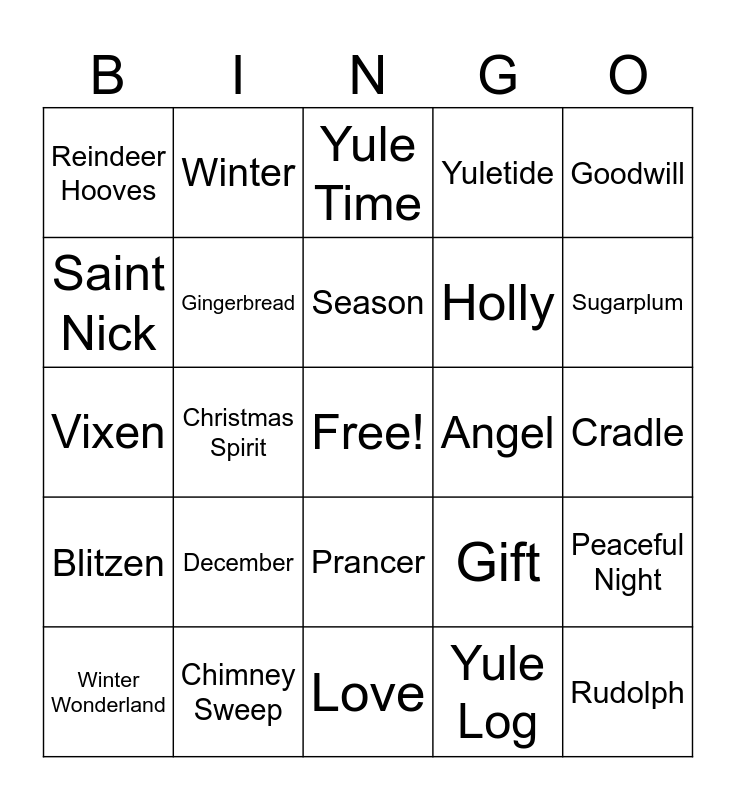 This bingo card has a free space and 150 words: Santa, Reindeer, Elf, Snowflake, Stocking, Present, Ornament, Wreath, Mistletoe, Chimney, Sleigh, Candy Cane, Holly, Bell, Gingerbread, Tree, Lights, Carols, Snowman, Eggnog, Poinsettia, Frosty, North Pole, Tinsel, Nutcracker, Holiday, Star, Angel, Cookies, Peppermint, Yule Log, Peace, Joy, Faith, Garland, Chestnuts, Fireplace, Icicle, Rudolph, Jingle Bells, Grinch, Noel, Goodwill, Ho Ho Ho, Scrooge, Silent Night, Festive, Tidings, Blitzen, Dasher, Dancer, Prancer, Vixen, Comet, Cupid, Donner, Happy, Merry, Celebration, Frostbite, Evergreen, December, Saint Nick, Cheer, Wish, Yuletide, Winter, Frost, Warmth, Love, Gift, Kindness, Magic, Tradition, Wonder, Spirit, Hearth, Glow, Season, Icicles, Feast, Sleigh Ride, Joyful, Family, Cradle, Candle, Snow, Twinkle, Krampus, Bethlehem, Holiday Card, Presents, Wrapping Paper, Ribbon, Bow, Twelve Days, Chimney Stocking, North Star, Starry Night, Noel's Song, Pinecones, Snowstorm, Frosting, Sugarplum, Bells, Warm Cocoa, Ice Skating, Sledding, Pine Trees, Snow Drift, Midnight Mass, Nativity, Angel Choir, White Christmas, Fireplace Glow, Jolly, Greetings, Yule Time, Holiday Feast, Bells Chime, Manger, Christmas Eve, North Star, Reindeer Hooves, Chimney Sweep, Starlight, Peaceful Night, Christmas Spirit, Gift Exchange, Cozy Fire, Fir Tree, Gingerbread House, Caroling, Holly Berries, Sleigh Bells, Snow Angel, Glistening Snow, Winter Wonderland, Holiday Cheer, Mulled Wine, Icicle Glow, Frozen Lake, Tree Topper, Stocking Stuffer, Christmas Star, Midnight Sleigh, Mistletoe Kiss, Snowball Fight, Winter Frost and Santa's Workshop.