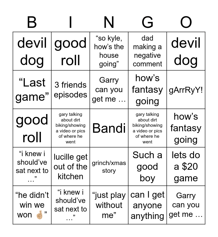 This bingo card has a free space and 70 words: you want your frisbee, Garry can you get me …, “he didn’t win we won 🤞🏼”, gary your playing, gArrRyY!, gary talking about dirt biking/showing a video or pics of where he went, 3 friends episodes, dot dot dot, how’s fantasy going, “so kyle, how’s the house going”, good roll, “STAR STAR!!”, dad making a negative comment, devil dog, haha like haha like, lucille get out of the kitchen, “just play without me”, Such a good boy, or when she goes to do dishes instead of playing/ “mom come sit down”, “Last game”, “i knew i should’ve sat next to …”, grinch/xmas story, can I get anyone anything, lets do a $20 game, “i knew i should’ve sat next to …”, grinch/xmas story, 3 friends episodes, dot dot dot, how’s fantasy going, “so kyle, how’s the house going”, good roll, “STAR STAR!!”, haha like haha like, lucille get out of the kitchen, “just play without me”, Such a good boy, or when she goes to do dishes instead of playing/ “mom come sit down”, “Last game”, dad making a negative comment, devil dog, you want your frisbee, Garry can you get me …, “he didn’t win we won 🤞🏼”, gary your playing, gArrRyY!, gary talking about dirt biking/showing a video or pics of where he went, lets do $20 a game, Can i get anyone anything, “STAR STAR!!”, dad making a negative comment, devil dog, you want your frisbee, Garry can you get me …, “he didn’t win we won 🤞🏼”, gary your playing, gArrRyY!, gary talking about dirt biking/showing a video or pics of where he went, 3 friends episodes, dot dot dot, how’s fantasy going, “so kyle, how’s the house going”, good roll, haha like haha like, lucille get out of the kitchen, “just play without me”, Such a good boy, or when she goes to do dishes instead of playing/ “mom come sit down”, “Last game”, “i knew i should’ve sat next to …” and grinch/xmas story.