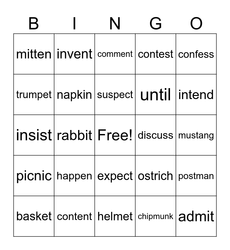 This bingo card has a free space and 45 words: absent, admit, attract, basket, cactus, chipmunk, comment, compost, confess, content, contest, discuss, expect, happen, hello, helmet, insect, insist, insult, intend, invent, kitten, magnet, mitten, muffin, mustang, nutmeg, object, ostrich, picnic, plastic, postman, problem, pumpkin, puppet, rabbit, subject, subtract, sudden, suspect, trumpet, until, upset, napkin and publish.