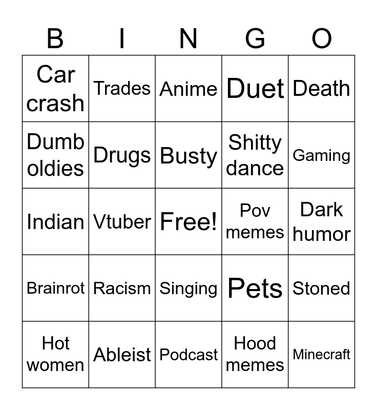This bingo card has a free space and 24 words: Racism, Ableist, Busty, Hot women, Death, Car crash, Dumb oldies, Trades, Pov memes, Singing, Shitty dance, Indian, Pets, Stoned, Drugs, Hood memes, Dark humor, Anime, Gaming, Vtuber, Minecraft, Brainrot, Duet and Podcast.
