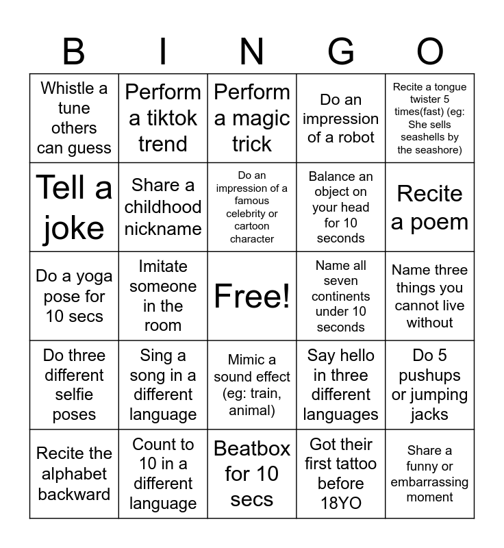 This bingo card has a free space and 25 words: Sing a song in a different language, Beatbox for 10 secs, Do an impression of a famous celebrity or cartoon character, Recite the alphabet backward, Recite a tongue twister 5 times(fast) (eg: She sells seashells by the seashore), Whistle a tune others can guess, Tell a joke, Perform a tiktok trend, Name all seven continents under 10 seconds, Mimic a sound effect (eg: train, animal), Balance an object on your head for 10 seconds, Do a yoga pose for 10 secs, Say hello in three different languages, Do 5 pushups or jumping jacks, Share a childhood nickname, Guess someone's favourite color correctly, Name three things you cannot live without, Perform a magic trick, Recite a poem, Imitate someone in the room, Share a funny or embarrassing moment, Count to 10 in a different language, Do three different selfie poses, Do an impression of a robot and Got their first tattoo before 18YO.