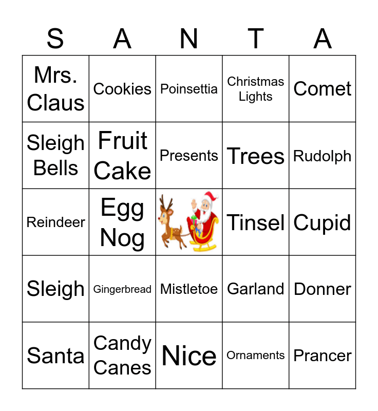 This bingo card has a free space and 46 words: Frosty the Snowman, Candy Canes, Christmas Carols, Gifts, Rudolph, Sleigh, Cookies, Jingle Bells, Trees, Prancer, Sleigh Bells, Fruit Cake, Ornaments, Donner, Elves, Yule Log, Presents, Garland, Blitzen, Mrs. Claus, Gingerbread, Stockings, Christmas Lights, Comet, North Pole, Egg Nog, Mistletoe, Wreath, Cupid, Reindeer, Hot Chocolate, Naughty, Tree Topper, Dasher, Toys, Peppermint, Nice, Silver Bells, Vixen, Santa, Milk, Poinsettia, Tinsel, Dancer, Oranges and Decorations.