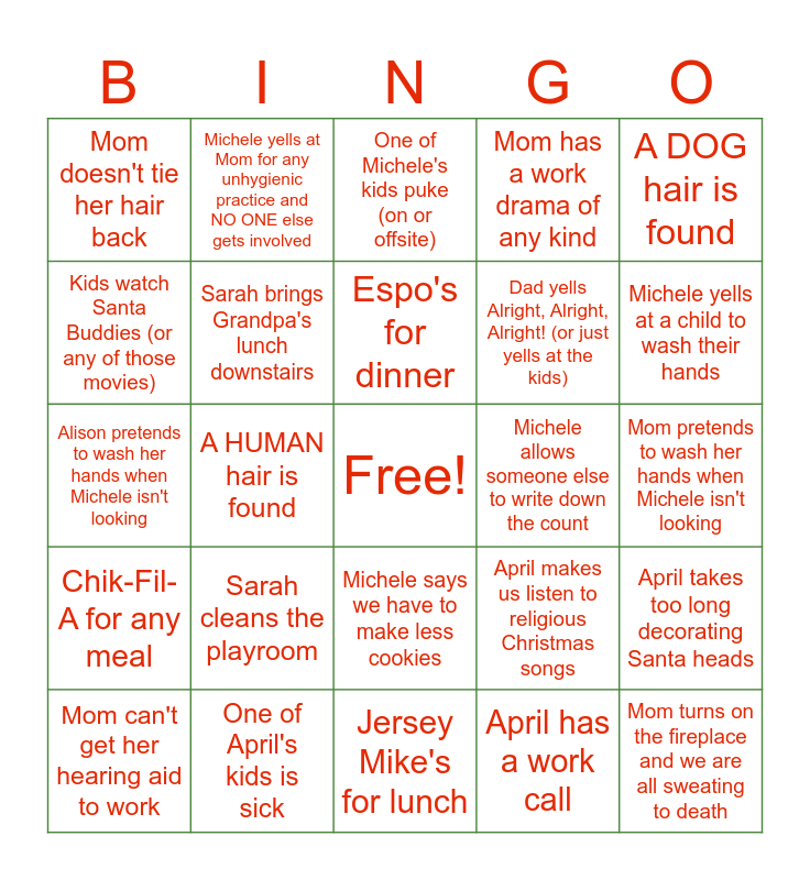 This bingo card has a free space and 29 words: Mom says she is never doing this again, One of April's kids is sick, One of Michele's kids puke (on or offsite), Something explodes in the fridge, A DOG hair is found, Mom doesn't tie her hair back, Sarah brings Grandpa's lunch downstairs, Espo's for dinner, Michele allows someone else to write down the count, April takes too long decorating Santa heads, Mom can't get her hearing aid to work, A HUMAN hair is found, April has a work call, Mom turns on the fireplace and we are all sweating to death, Alison pretends to wash her hands when Michele isn't looking, Kids try to race bouncy horses thru the no fly zone, Jersey Mike's for lunch, April makes us listen to religious Christmas songs, Michele yells at a child to wash their hands, Chik-Fil-A for any meal, Sarah cleans the playroom, April complains that she hates Michele's Christmas playlist, Dad yells Alright, Alright, Alright! (or just yells at the kids), Mom pretends to wash her hands when Michele isn't looking, Kids watch Santa Buddies (or any of those movies), Michele yells at Mom for any unhygienic practice and NO ONE else gets involved, Michele says we have to make less cookies, Mom has a work drama of any kind and We watch White Christmas (in the background).