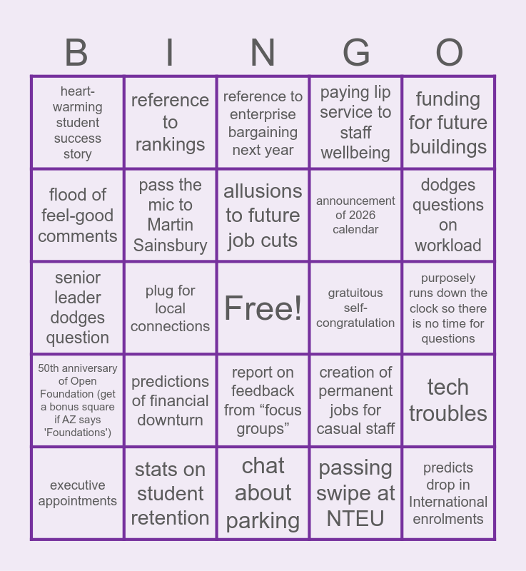 This bingo card has a free space and 24 words: predictions of financial downturn, stats on student retention, allusions to future job cuts, executive appointments, funding for future buildings, heart-warming student success story, flood of feel-good comments, reference to rankings, gratuitous self-congratulation, report on feedback from “focus groups”, announcement of 2026 calendar, senior leader dodges question, creation of permanent jobs for casual staff, tech troubles, pass the mic to Martin Sainsbury, passing swipe at NTEU, purposely runs down the clock so there is no time for questions, reference to enterprise bargaining next year, dodges questions on workload, plug for local connections, predicts drop in International enrolments, 50th anniversary of Open Foundation (get a bonus square if AZ says 'Foundations'), paying lip service to staff wellbeing and chat about parking.