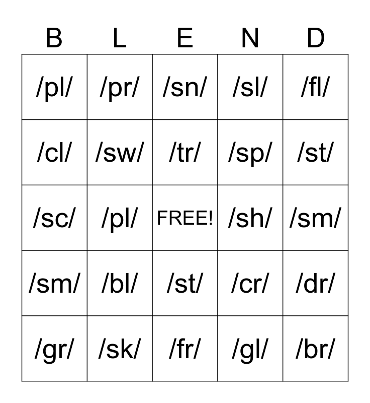 This bingo card has a free space and 24 words: /bl/, /sk/, /tr/, /gr/, /fl/, /pl/, /cl/, /pr/, /sh/, /st/, /sp/, /sc/, /cr/, /dr/, /sw/, /gl/, /sm/, /sn/, /st/, /pl/, /br/, /sm/, /sl/ and /fr/.