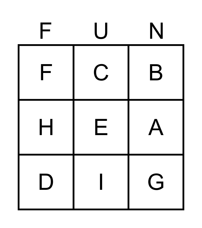 This bingo card has a free space and 8 words: A, B, C, D, F, G, H and I.