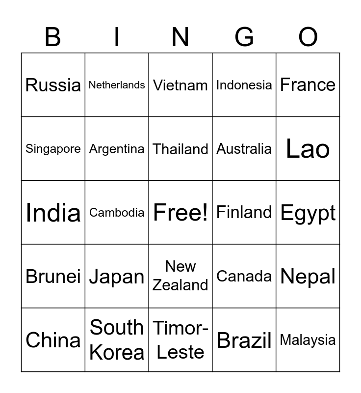 This bingo card has a free space and 24 words: Japan, South Korea, Thailand, China, France, Russia, Singapore, Netherlands, Finland, New Zealand, Australia, India, Canada, Nepal, Argentina, Brazil, Egypt, Vietnam, Lao, Cambodia, Malaysia, Brunei, Indonesia and Timor-Leste.