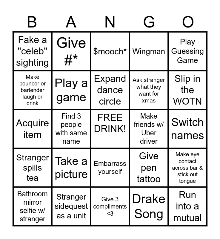 This bingo card has a free space and 24 words: Take a picture, Stranger sidequest as a unit, Expand dance circle, Bathroom mirror selfie w/ stranger, Play Guessing Game, Fake a "celeb" sighting, Make bouncer or bartender laugh or drink, Give #*, Make friends w/ Uber driver, Embarrass yourself, Ask stranger what they want for xmas, Acquire item, Give pen tattoo, Make eye contact across bar & stick out tongue, Play a game, Drake Song, Switch names, $mooch*, Slip in the WOTN, Find 3 people with same name, Run into a mutual, Stranger spills tea, Wingman and Give 3 compliments <3.