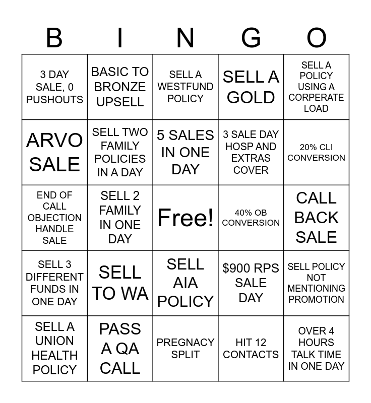 This bingo card has a free space and 26 words: SELL AIA POLICY, HIT 12 CONTACTS, 5 SALES IN ONE DAY, PASS A QA CALL, SELL A POLICY USING A CORPERATE LOAD, 3 DAY SALE, 0 PUSHOUTS, ARVO SALE, BASIC TO BRONZE UPSELL, CALL BACK SALE, $900 RPS SALE DAY, 3 SALE DAY HOSP AND EXTRAS COVER, END OF CALL OBJECTION HANDLE SALE, SELL POLICY NOT MENTIONING PROMOTION, SELL A UNION HEALTH POLICY, SELL 2 FAMILY IN ONE DAY, SELL TO NT, SELL A GOLD, SELL 3 DIFFERENT FUNDS IN ONE DAY, SELL A WESTFUND POLICY, OVER 4 HOURS TALK TIME IN ONE DAY, 20% CLI CONVERSION, PREGNACY SPLIT, 40% OB CONVERSION, SELL TO WA, SELL TWO FAMILY POLICIES IN A DAY and $500 A MONTH SALE.