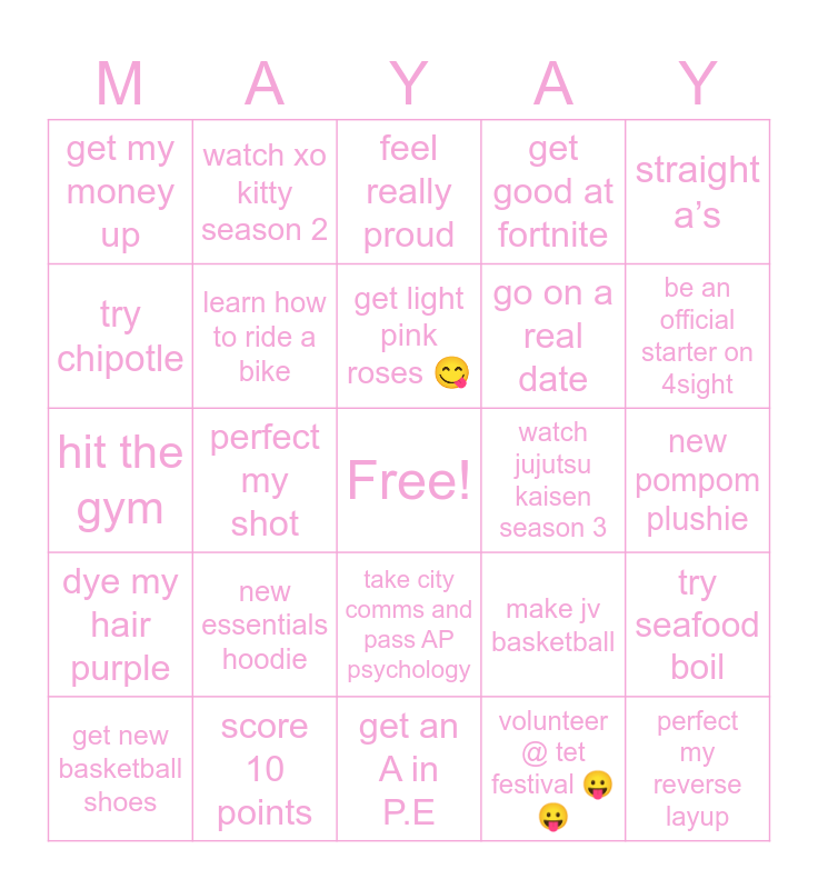 This bingo card has a free space and 24 words: new essentials hoodie, score 10 points, get light pink roses π, get new basketball shoes, straight aβs, get my money up, try chipotle, watch xo kitty season 2, watch jujutsu kaisen season 3, take city comms and pass AP psychology, go on a real date, hit the gym, make jv basketball, try seafood boil, learn how to ride a bike, volunteer @ tet festival ππ, new pompom plushie, feel really proud, be an official starter on 4sight, perfect my shot, perfect my reverse layup, dye my hair purple, get good at fortnite and get an A in P.E.
