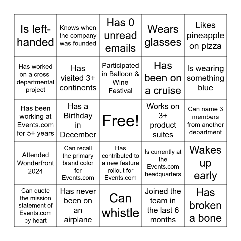This bingo card has a free space and 29 words: Can quote the mission statement of Events.com by heart, Has attended a marathon or sporting event, Has a Birthday in December, Has a pet, Is left-handed, Has 0 unread emails, Has visited 3+ continents, Can recall the primary brand color for Events.com, Works on 3+ product suites, Has never been on an airplane, Can name 3 members from another department, Has broken a bone, Can whistle, Joined the team in the last 6 months, Is wearing something blue, Can speak 3+ languages, Has contributed to a new feature rollout for Events.com, Attended Wonderfront 2024, Likes pineapple on pizza, Has been working at Events.com for 5+ years, Is currently at the Events.com headquarters, Enjoys playing video games, Has been on a cruise, Has worked on a cross-departmental project, Wears glasses, Knows when the company was founded, Wakes up early, Participated in Balloon & Wine Festival and Can use chopsticks.