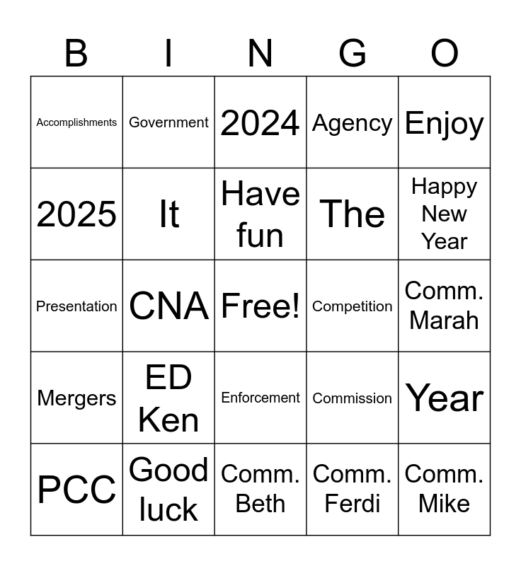 This bingo card has a free space and 29 words: PCC, Thank you, CNA, Congratulations, Accomplishments, 2024, It, ED Ken, Competition, Good luck, Comm. Marah, Comm. Mike, Comm. Beth, Comm. Ferdi, Happy New Year, Merry Christmas, Enforcement, Mergers, Enjoy, Presentation, Commission, Good afternoon/ Good evening, The, 2025, Agency, Government, Year, Have fun and Raffle.