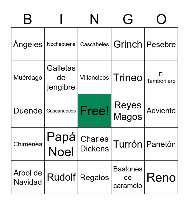 This bingo card has a free space and 24 words: Papá Noel, Rudolf, Villancicos, Árbol de Navidad, Pesebre, Ángeles, Muérdago, Nochebuena, Reyes Magos, Charles Dickens, Trineo, Duende, Turrón, Panetón, Galletas de jengibre, Bastones de caramelo, Adviento, Cascabeles, El Tamborilero, Cascanueces, Reno, Chimenea, Grinch and Regalos.