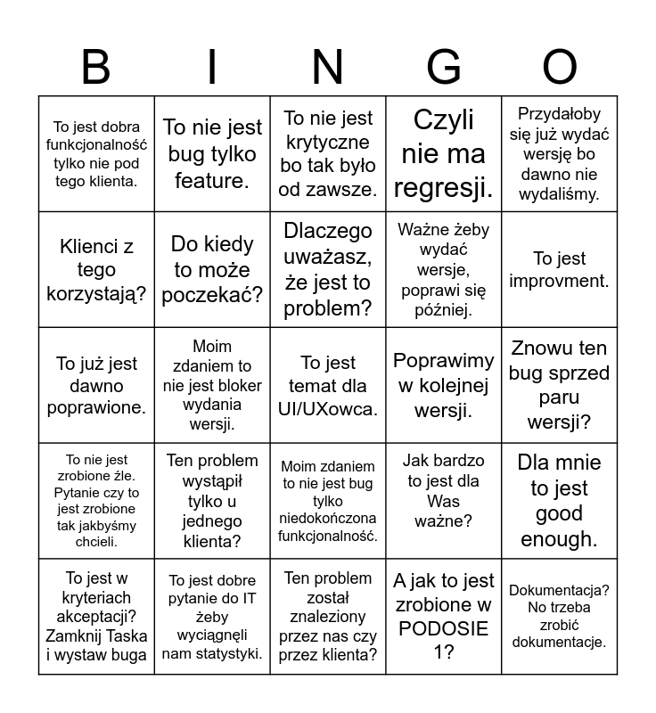 This bingo card has 25 words: Ten problem wystąpił tylko u jednego klienta?, Ten problem został znaleziony przez nas czy przez klienta?, Dlaczego uważasz, że jest to problem?, To jest w kryteriach akceptacji? Zamknij Taska i wystaw buga, Przydałoby się już wydać wersję bo dawno nie wydaliśmy., To jest dobra funkcjonalność tylko nie pod tego klienta., Klienci z tego korzystają?, To nie jest bug tylko feature., Poprawimy w kolejnej wersji., Moim zdaniem to nie jest bug tylko niedokończona funkcjonalność., Ważne żeby wydać wersje, poprawi się później., To już jest dawno poprawione., Jak bardzo to jest dla Was ważne?, Dla mnie to jest good enough., Do kiedy to może poczekać?, Dokumentacja? No trzeba zrobić dokumentacje., Znowu ten bug sprzed paru wersji?, To nie jest krytyczne bo tak było od zawsze., To jest improvment., Moim zdaniem to nie jest bloker wydania wersji., To jest temat dla UI/UXowca., To jest dobre pytanie do IT żeby wyciągnęli nam statystyki., To nie jest zrobione źle. Pytanie czy to jest zrobione tak jakbyśmy chcieli., Czyli nie ma regresji. and A jak to jest zrobione w PODOSIE 1?.