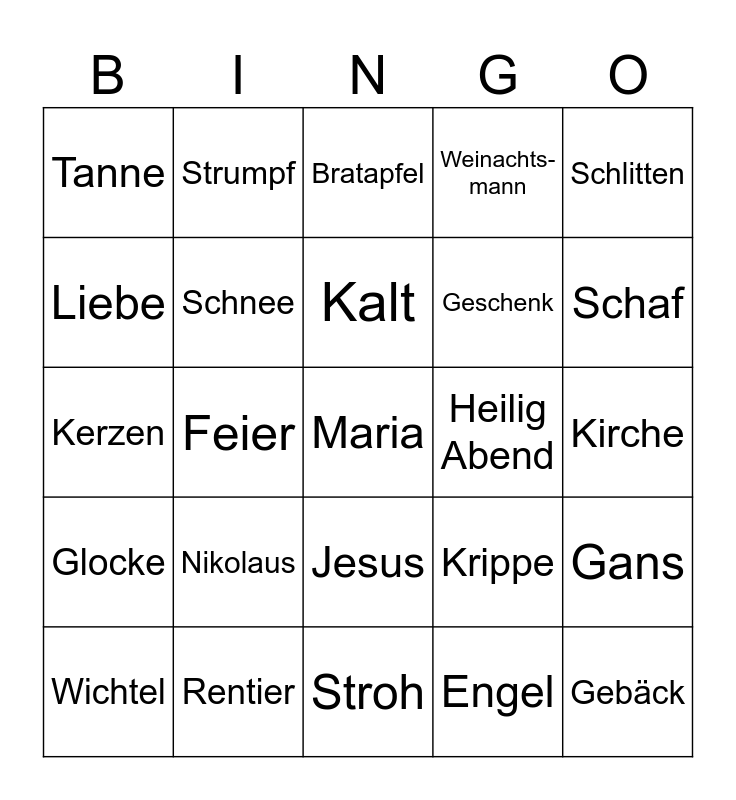 This bingo card has 30 words: Rentier, Mütze, Feier, Ente, Tanne, Bratapfel, Schnee, Jesus, Heilig Abend, Stroh, Kirche, Maria, Engel, Gebäck, Schaf, Lebkuchen, Krippe, Glocke, Nikolaus, Schlitten, Kerzen, Rute, Strumpf, Geschenk, Liebe, Weinachts-mann, Gans, Wichtel, Kalt and Plätzchen.