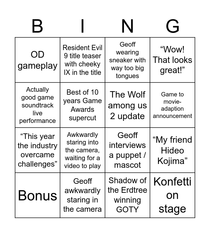 This bingo card has 16 words: Geoff awkwardly staring in the camera, “My friend Hideo Kojima”, Geoff wearing sneaker with way too big tongues, OD gameplay, “This year the industry overcame challenges”, Resident Evil 9 title teaser with cheeky IX in the title, Geoff interviews a puppet / mascot, Shadow of the Erdtree winning GOTY, Actually good game soundtrack live performance, Best of 10 years Game Awards supercut, Bonus, “Wow! That looks great!”, Awkwardly staring into the camera, waiting for a video to play, Game to movie-adaption announcement, The Wolf among us 2 update and Konfetti on stage.