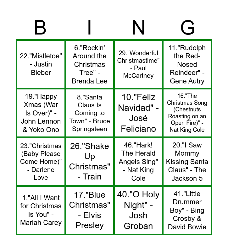 This bingo card has 51 words: Free!, 1."All I Want for Christmas Is You" - Mariah Carey, 2."Last Christmas" - Wham!, 3."Jingle Bell Rock" - Bobby Helms, 4."White Christmas" - Bing Crosby, 5."It's the Most Wonderful Time of the Year" - Andy Williams, 6."Rockin' Around the Christmas Tree" - Brenda Lee, 7."Silent Night" - Bing Crosby, 8."Santa Claus Is Coming to Town" - Bruce Springsteen, 9."Let It Snow! Let It Snow! Let It Snow!" - Dean Martin, 10."Feliz Navidad" - José Feliciano, 11."Rudolph the Red-Nosed Reindeer" - Gene Autry, 12."Holly Jolly Christmas" - Burl Ives, 13."Winter Wonderland" - Johnny Mathis, 14."Have Yourself a Merry Little Christmas" - Judy Garland, 15."Do They Know It's Christmas?" - Band Aid, 16."The Christmas Song (Chestnuts Roasting on an Open Fire)" - Nat King Cole, 17."Blue Christmas" - Elvis Presley, 18."Baby, It’s Cold Outside" - Dean Martin & Martina McBride, 19."Happy Xmas (War Is Over)" - John Lennon & Yoko Ono, 20."I Saw Mommy Kissing Santa Claus" - The Jackson 5, 21."Underneath the Tree" - Kelly Clarkson, 22."Mistletoe" - Justin Bieber, 23."Christmas (Baby Please Come Home)" - Darlene Love, 24."One More Sleep" - Leona Lewis, 25."Santa Tell Me" - Ariana Grande, 26."Shake Up Christmas" - Train, 27."Christmas Time (Don't Let the Bells End)" - The Darkness, 28."My Only Wish (This Year)" - Britney Spears, 29."Wonderful Christmastime" - Paul McCartney, 30."This Christmas" - Donny Hathaway, 31."You Make It Feel Like Christmas" - Gwen Stefani & Blake Shelton, 32."Wrapped in Red" - Kelly Clarkson, 33."Christmas Tree Farm" - Taylor Swift, 34."Like It's Christmas" - Jonas Brothers, 35."Step Into Christmas" - Elton John, 36."Merry Christmas Everyone" - Shakin' Stevens, 37."Driving Home for Christmas" - Chris Rea, 38."Carol of the Bells" - Pentatonix, 39."Hallelujah" - Pentatonix, 40."O Holy Night" - Josh Groban, 41."Little Drummer Boy" - Bing Crosby & David Bowie, 42."Silver Bells" - Dean Martin, 43."Deck the Halls" - Traditional, 44."God Rest Ye Merry Gentlemen" - Traditional, 45."The First Noel" - Frank Sinatra, 46."Hark! The Herald Angels Sing" - Nat King Cole, 47."We Wish You a Merry Christmas" - Traditional, 48."O Come, All Ye Faithful" - Traditional, 49."Angels We Have Heard on High" - Andrea Bocelli and 50."Auld Lang Syne" - Traditional.