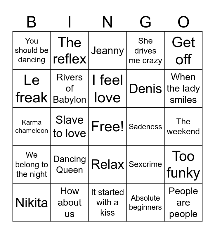 This bingo card has a free space and 24 words: Dancing Queen, How about us, I feel love, Nikita, Get off, You should be dancing, Le freak, The reflex, Sadeness, Relax, Denis, Karma chameleon, Sexcrime, Too funky, Rivers of Babylon, Absolute beginners, The weekend, Jeanny, When the lady smiles, Slave to love, People are people, We belong to the night, She drives me crazy and It started with a kiss.