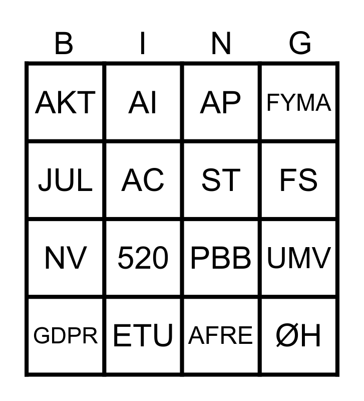 This bingo card has 16 words: ETU, UMV, AP, AKT, NV, AI, PBB, AFRE, JUL, AC, GDPR, FYMA, 520, FS, ST and ØH.