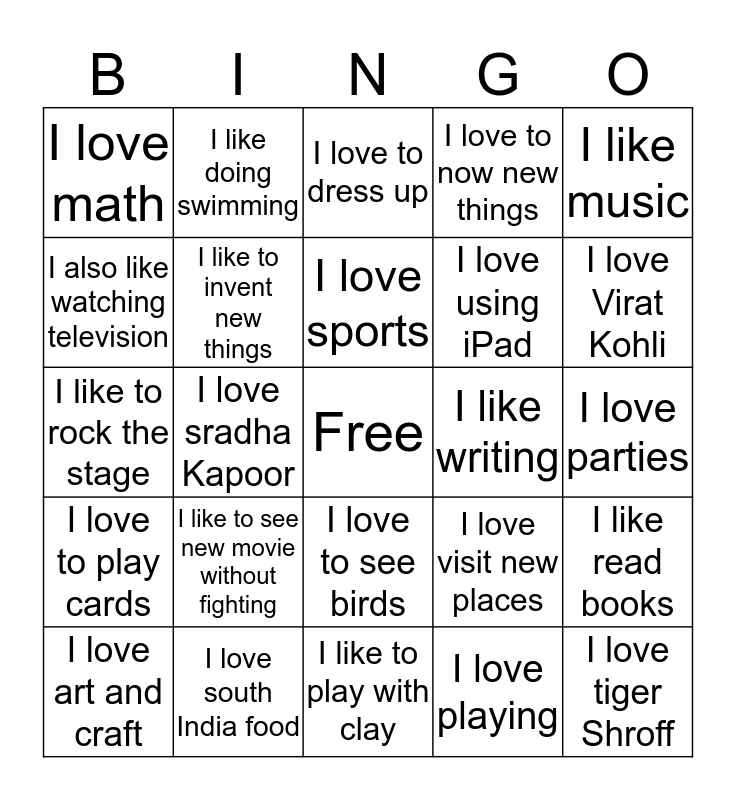 This bingo card has a free space and 24 words: I like to see new movie without fighting, I love south India food, I love sports, I love art and craft, I like music, I love math, I also like watching television, I like doing swimming, I like writing, I love to see birds, I love using iPad, I like to rock the stage, I love visit new places, I like read books, I like to invent new things, I love playing, I love parties, I love to dress up, I love Virat Kohli, I love sradha Kapoor, I love tiger Shroff, I love to play cards, I love to now new things and I like to play with clay.